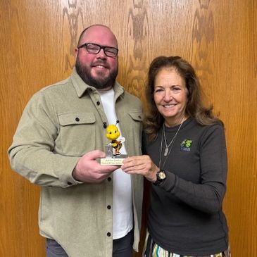 John Hutson, Love Bottling Special Events Coordinator, is holding the 2025 "Gold Bee" plaque presented by Susan Hoog, Director of the EOSSB.