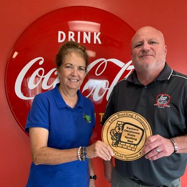 Director of Tourism and Exposition for the City of Muskogee is all smiles after being presented a BEE plaque recently from EOSSB Director, Susan Hoog.