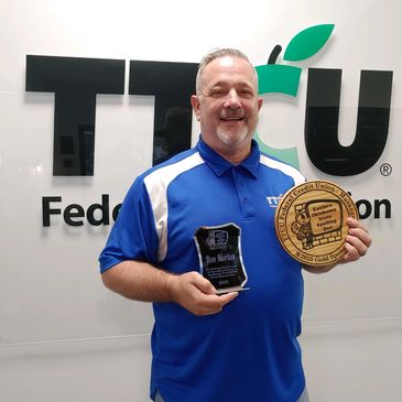 Ron Morton, Branch Manager, TTCU - Federal Credit Union - Muskogee, is all smiles as he accepts the "2025 EOSSB Gold Bee" plaque and special gift for his continuous support of our academic event.